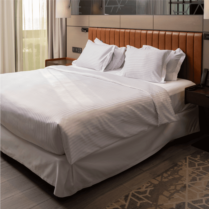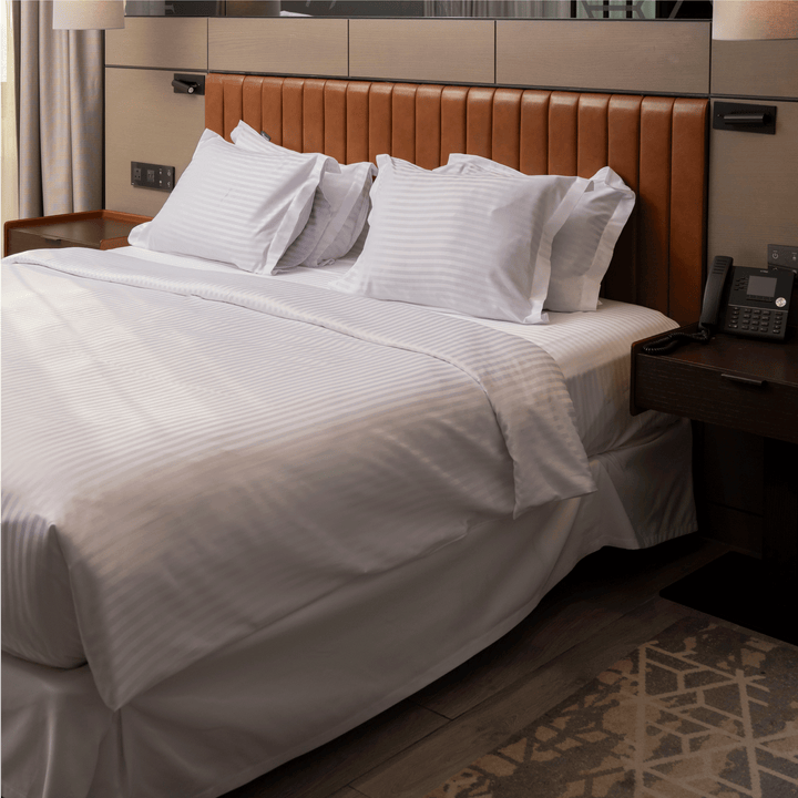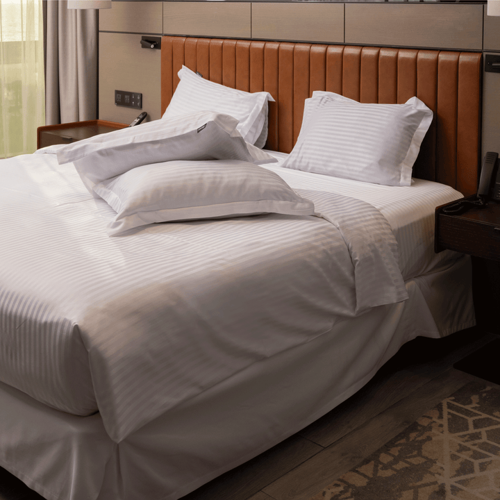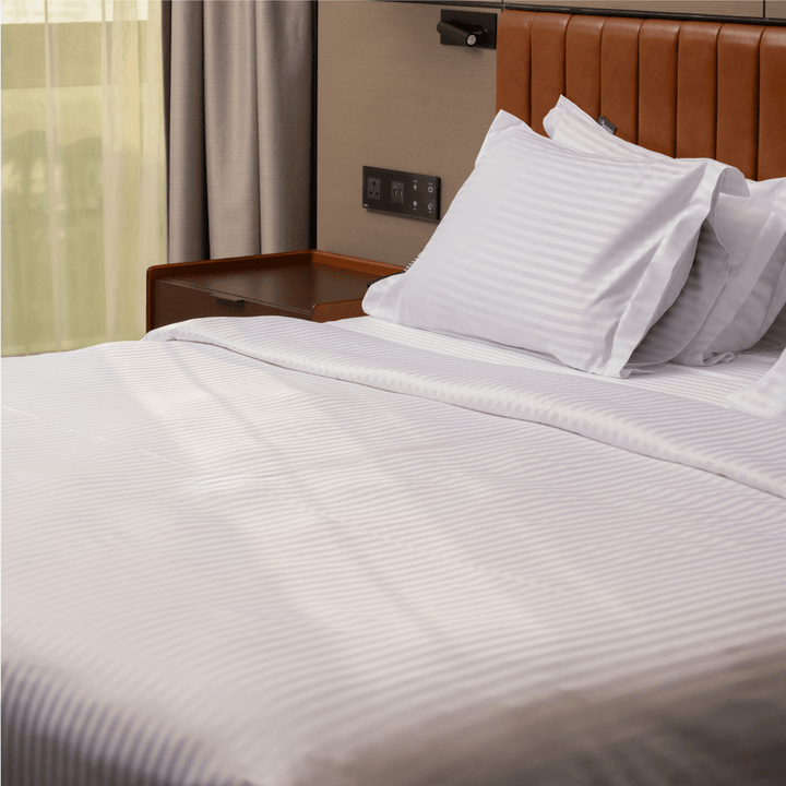 Indulge in luxury with our satin stripe duvet cover set. Made from 70% cotton with a high thread count, it offers a soft, smooth texture and a refined elegance for your bedroom.